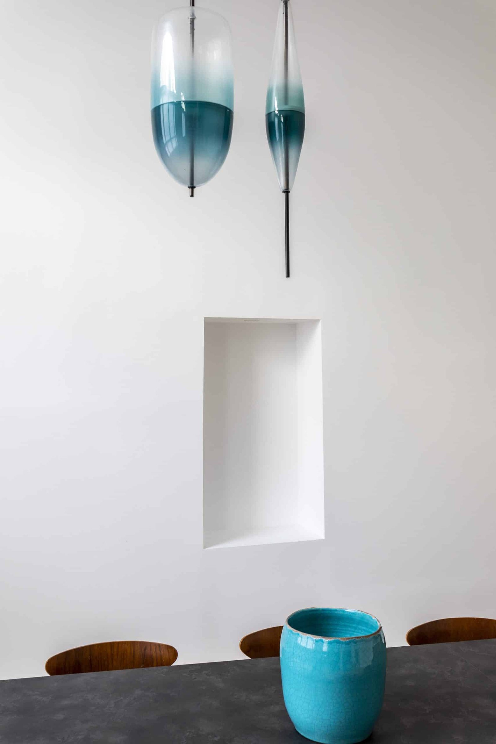 Côté salle à manger les meubles vintage sont mis en valeur dans un cadre volontairement sobre et épuré. La cuisine ouverte et un bureau aménagé pour le télétravail ont été cloisonnés par des verrières atelier. Après le bleu du salon, ici les teintes sont chaudes avec l’association du vert, du bois clair et du terracotta.