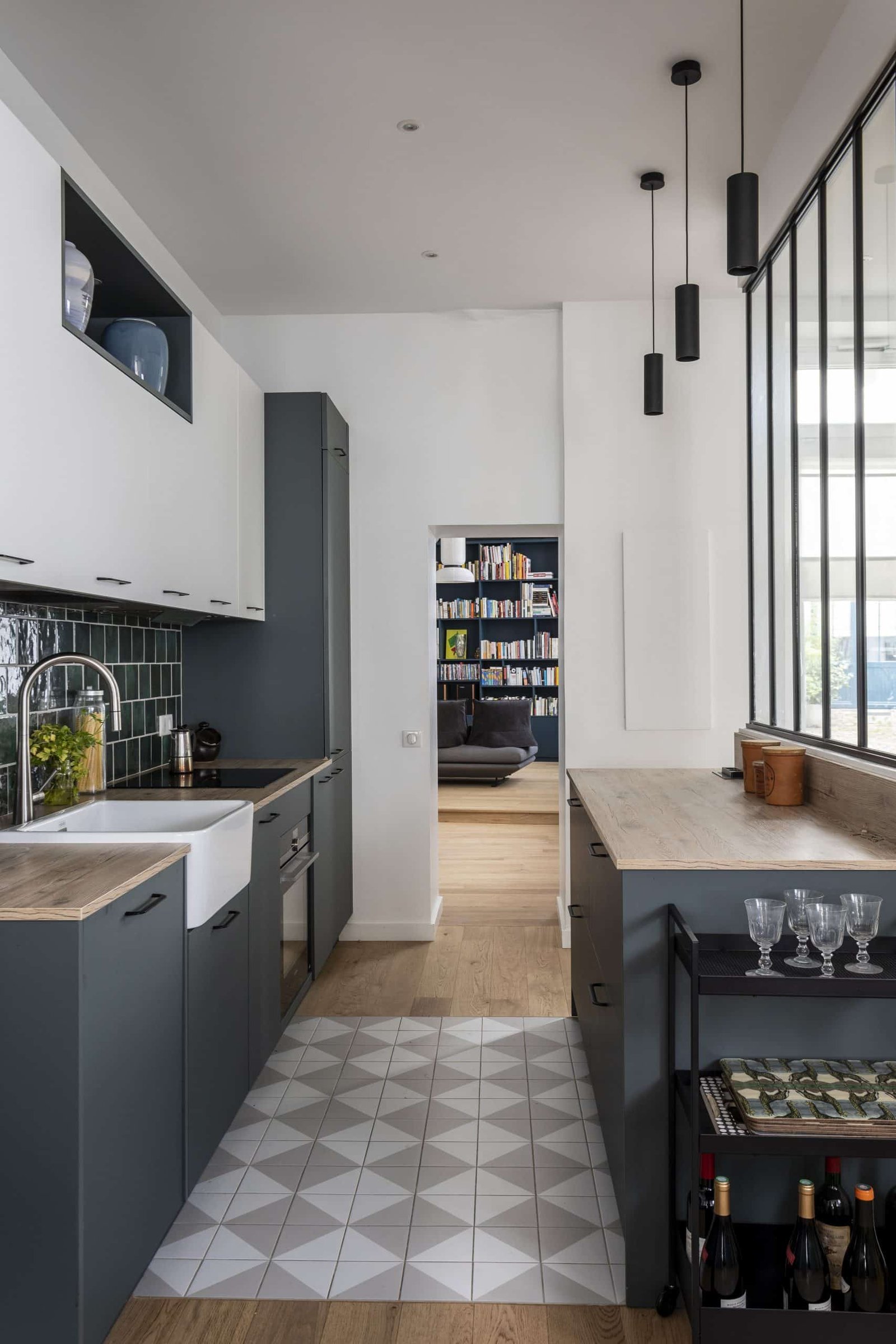 L’ancien garage s’est transformé en un salon / salle à manger spacieux et lumineux où nous avons créé une grande bibliothèque sur mesure qui épouse le mur à la fois en largeur et en hauteur. Peinte dans une teinte d’un bleu profond elle structure la pièce.