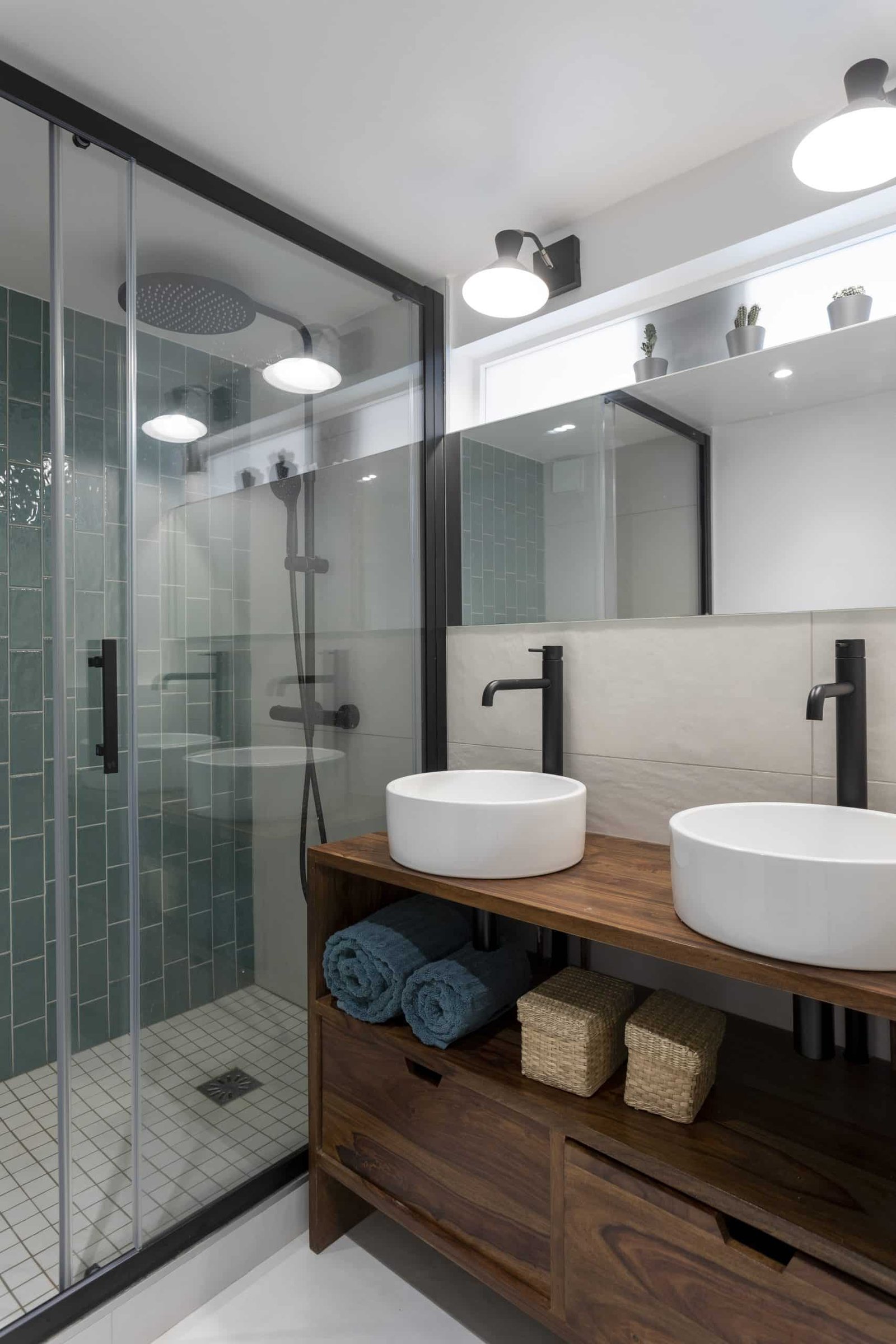 Papiers peints tendances et zelliges apportent les touches décoratives des salles de bains.