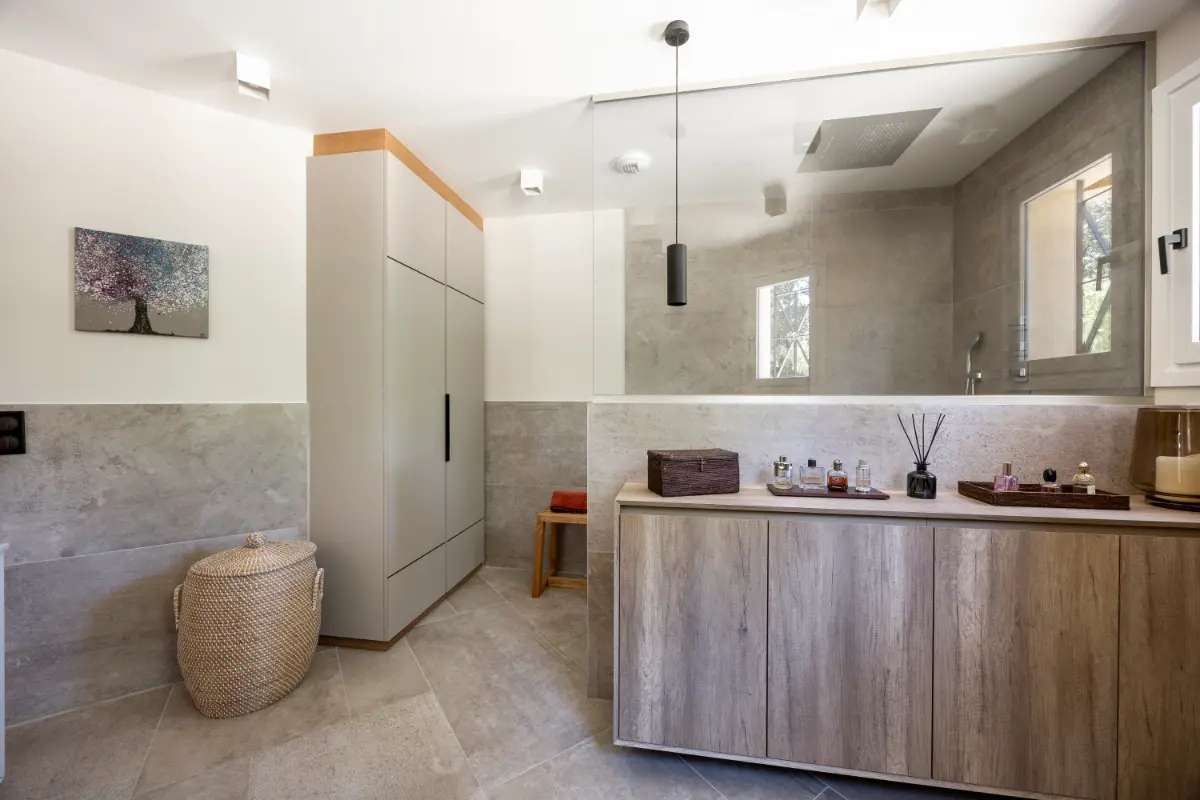 Each living space was designed to provide a unique experience, bathed in light and opening onto the Mediterranean landscape. The interior design, intentionally minimalist, enhances the essentials: the beauty of the structure and the generosity of the surrounding nature, which extends into the interiors.