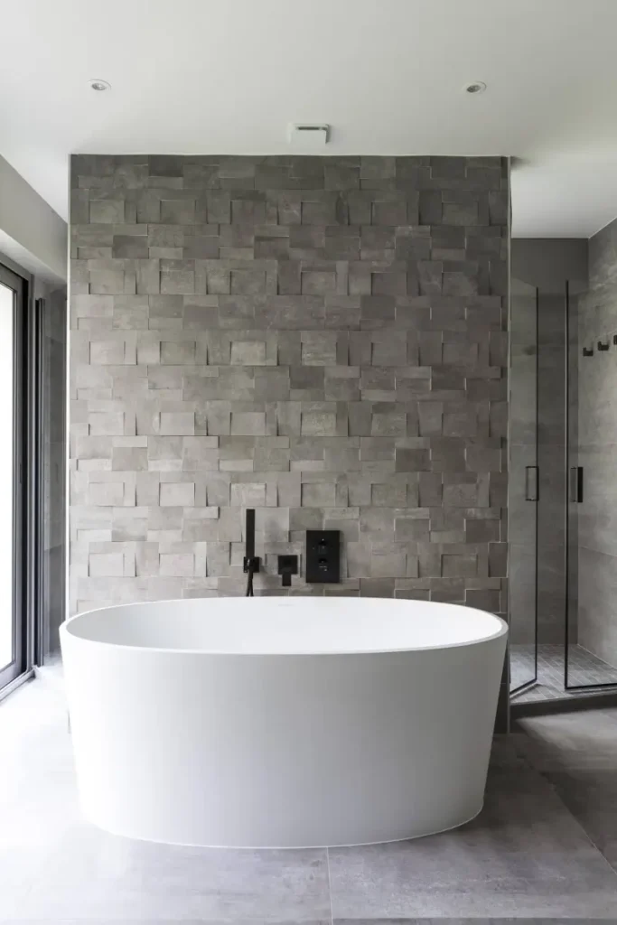 - Sélection de matériaux nobles et naturels : marbre, pierre naturelle, carrelage grand format, bois